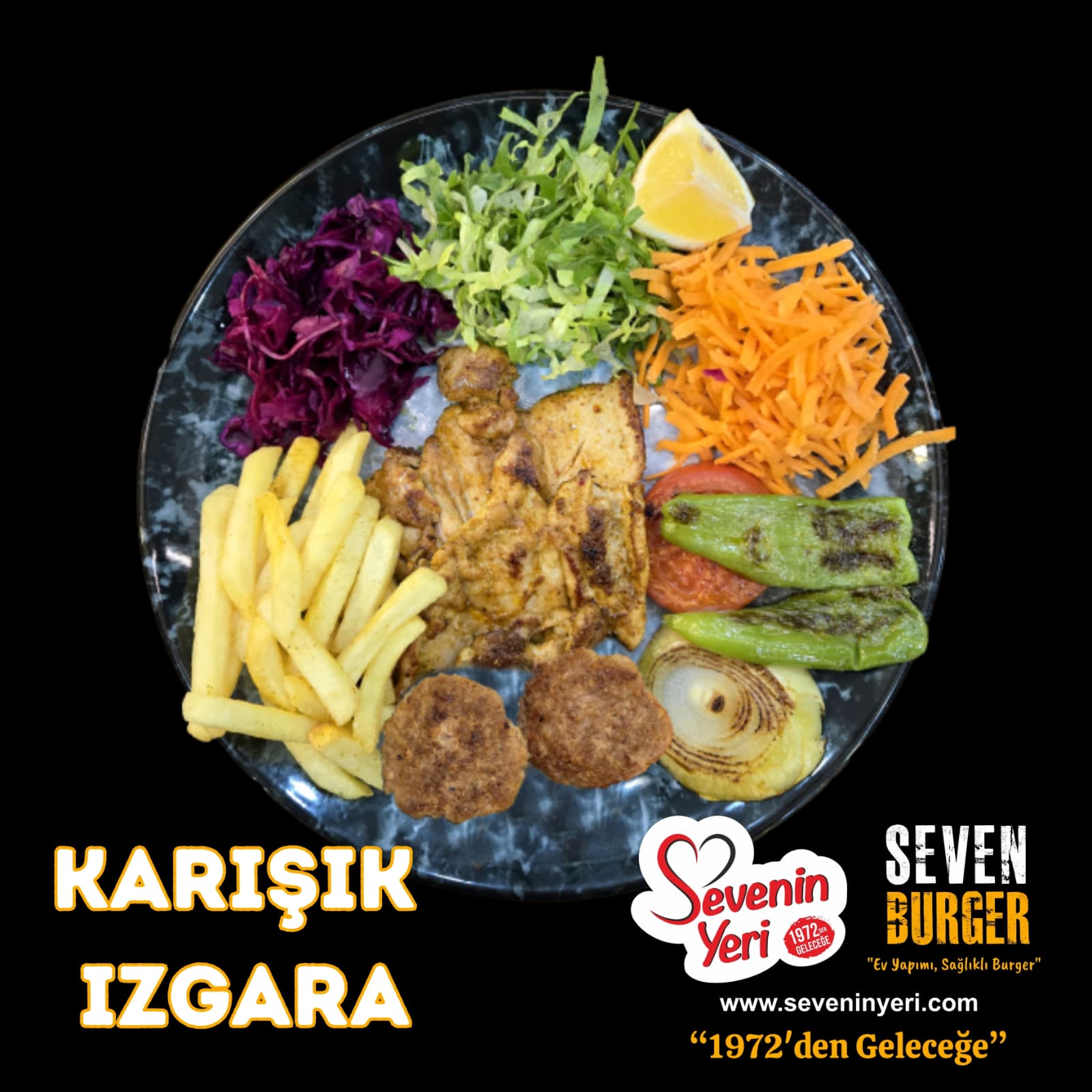 %100 dana kıymadan kendi el imalatımız olan katkısız ve sağlıklı köftemizi ve helal sertifikalı özel marine edilmiş tavuk ızgara etimizi közlenmiş domates, çarliston biber ve soğan ile birlikte yanında patates kızartması ile servis yapmaktayız.