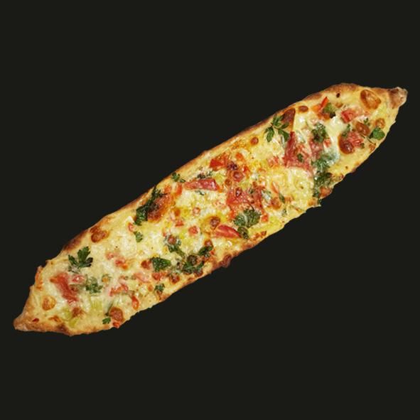 Vejetaryen ve diyet yapanlar için daha küçük hamura, köy peyniri, domates, çarliston, maydanoz, ve kapya biber ile ürettiğimiz diyet pidemiz.
